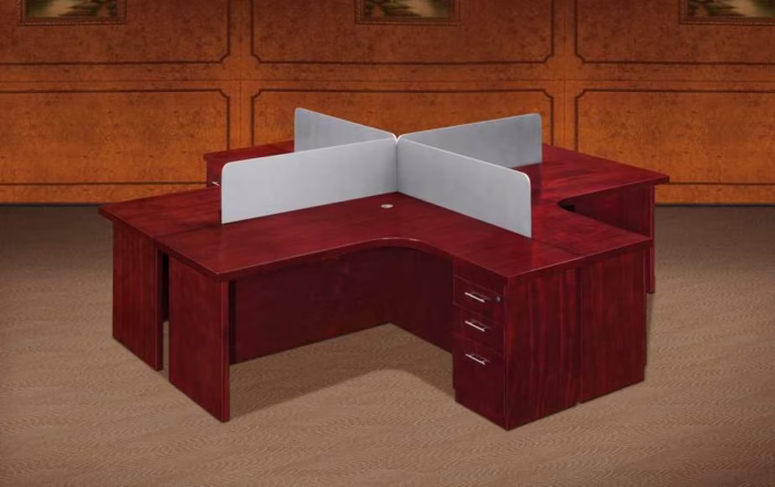 This cluster desk is designed for four users, each having a spacious workstation with pedestal drawers for storage. The silver wooden dividers provide privacy and separation between workstations and complement the mahogany veneer finish for a professional and elegant look.