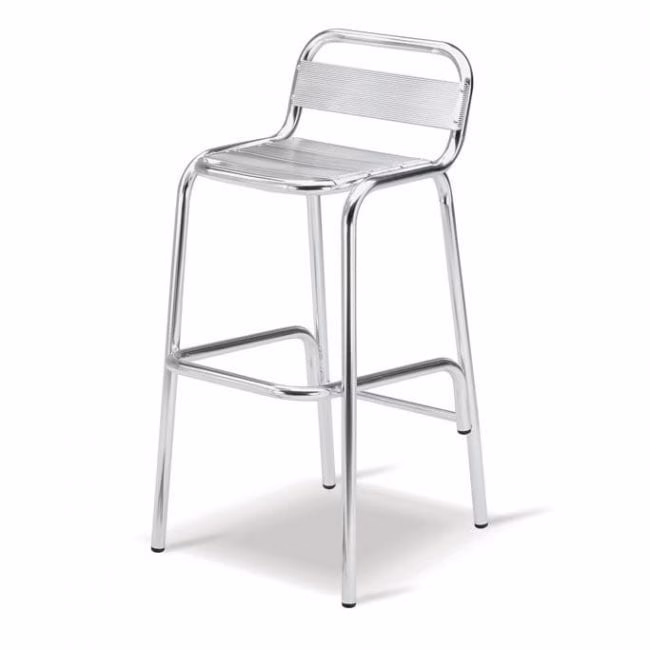 Cosmopolitan Aluminium Bar Chair Cosmopolitan Aluminium bar chair Seat Height: 790mm 100% Aluminium with welded Joints Suitable for Outdoors also comes with matching Round Table. With a 2 yrs guarantee