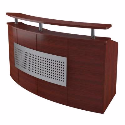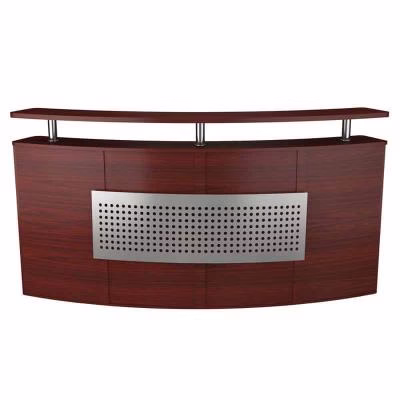 The Curved reception unit has a flowing, gentle form and is available in a wide range of melamine colours. The device is completed with a perforated silver plate and has an elevated countertop.