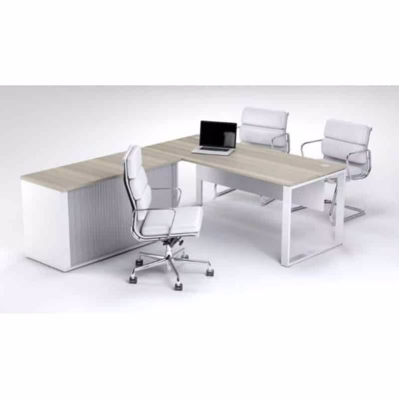 This l-form office computer desk features a melamine end, credenza and is ideal for an executive workplace or home office. Add sophistication for your managerial or executive office with our managerial workplace desk solutions. These l-form desks function credenzas or pedenzas