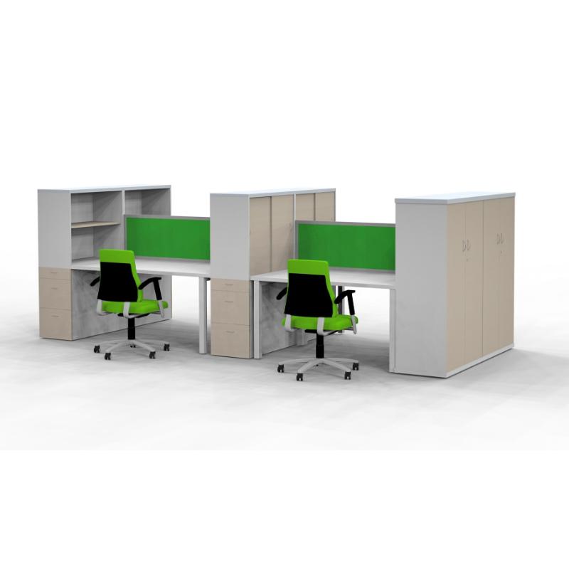 This innovative setup features 4 interconnected workstations, perfect for open-plan offices or team-based environments. Each workstation comes equipped with ample built-in storage, including: